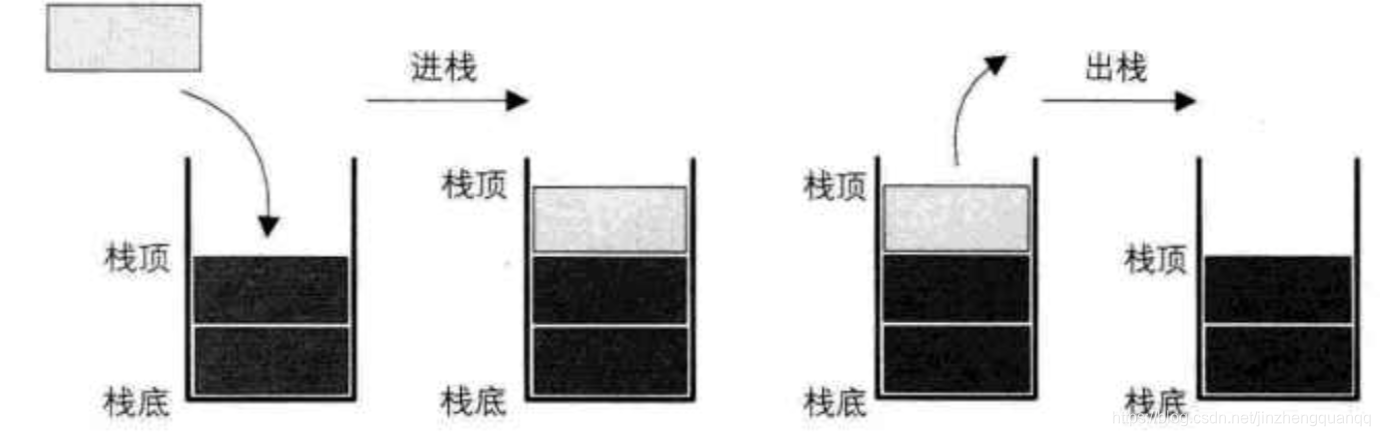 栈是限定仅在表尾进行插入和删除操作的线性表。允许插入和删除的一端称为栈顶,另一端称为栈底,不含任何数据元素的栈称为空栈,栈又称为后进先出(Last In First Out)的线性表,简称LIFO结构。
