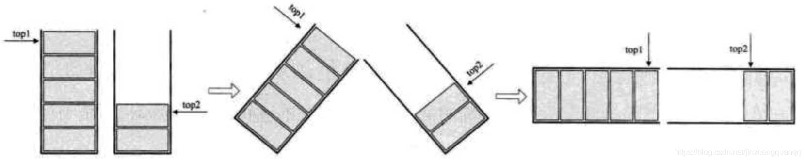 数组有两个端点,两个栈有两个栈底,让一个栈的栈底为数组的始端,即下标为0处,另一个栈为栈的末端,即下标为数组长度n-1处,这样两个栈如果增加元素,就是两端点向中间延伸。