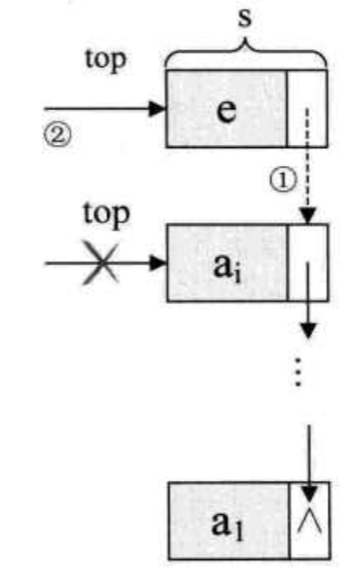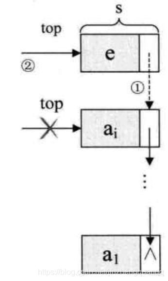 s->next = s->top; /*把当前的栈顶元素赋值给新结点的直接后继,如上图1*/