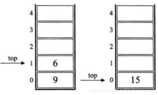6,下面是“+”,所以栈中6和9出栈,9与6相加,得到15,将15进栈