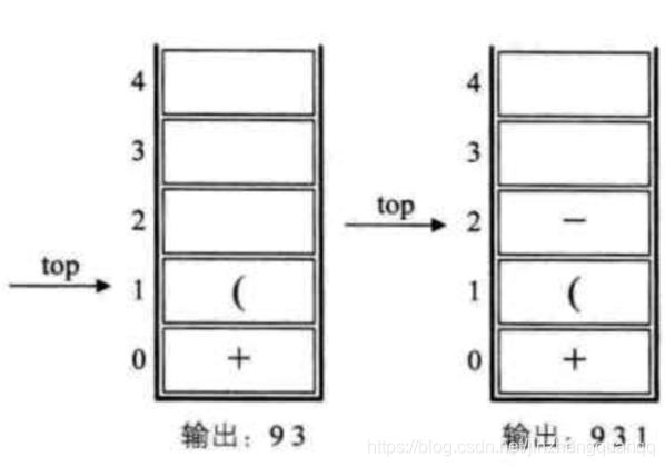5,接下来是数字1,输出,总表达式9 3 1,后面是符号“)”,此时,我们需要去匹配此前的“(”,所以栈顶依次出栈,并输出,直到“(”出栈为止,此时左括号上方只有“-”,因此输出“-”。总的输出表达式为9 3 1 -