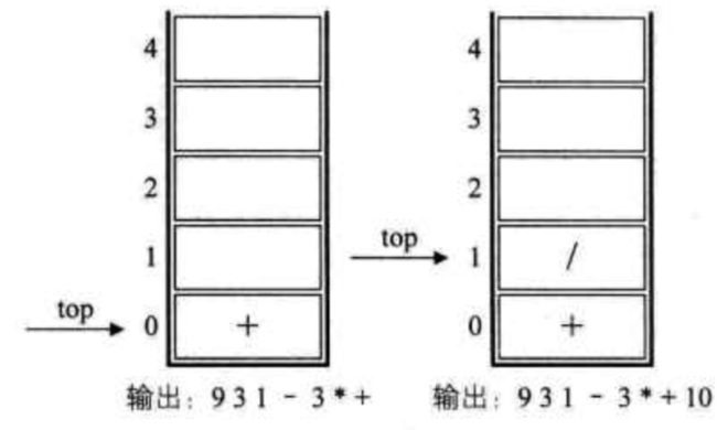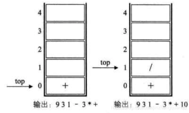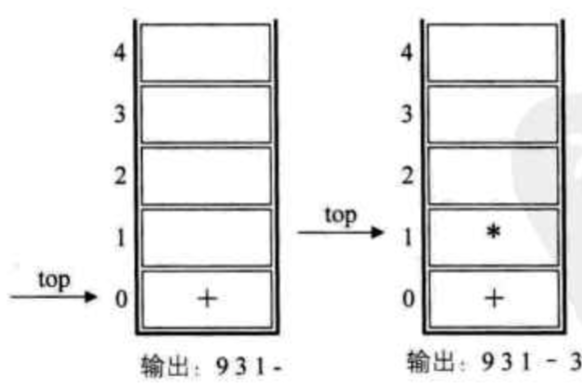 6,接着是数字3,输出,总的表达式为9 3 1 - 3 ,紧接着是符号“*”,因为此时的栈顶符号为“+”号,优先级低于“*”,因此不输出,“*”进栈