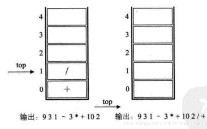 10,已经到最后,所以将栈中符号全部出栈并输出。最终输出的后缀表达式结果为9 3 1 - 3 * + 10 2 / +