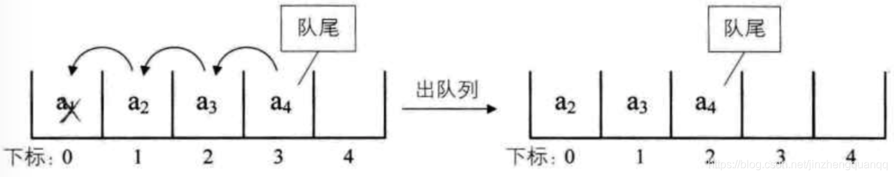 队列元素的出列是在队头,即下标为0的位置,那也就意味着,队列中的所有元素都得向前移动,以保证队列的队头,也就是下标为0的位置不为空,此时时间复杂度为O(n)