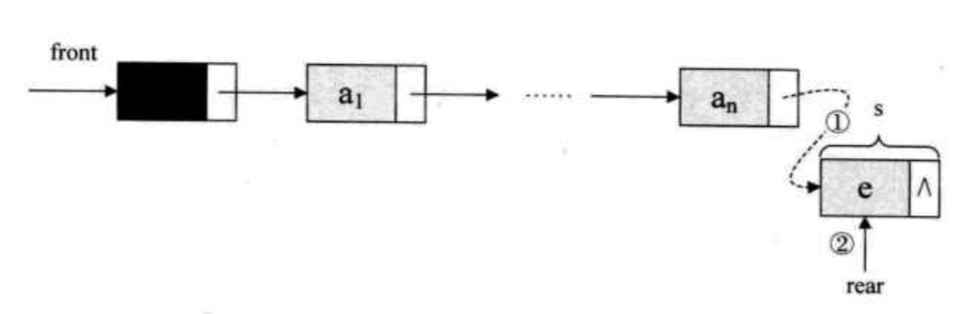 q->rear->next = s; /*把拥有元素e新结点s赋值给原队尾结点的后继,如上图1*/