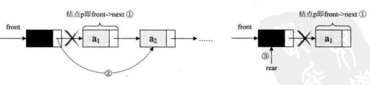 q->front->next = p->next; /*将原队头结点后继p->next赋值给其头结点后继,如上图2*/