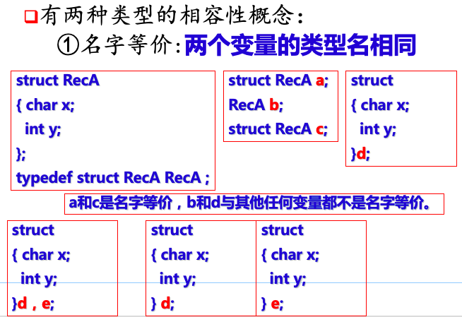 若T1和T2是两个类型,T1的任何值都可以赋予T2类型的变量,反之亦然,T1类型的实参可以对应类型T2的形参,反之亦然,则称T1和T2是相容的,或等价的;