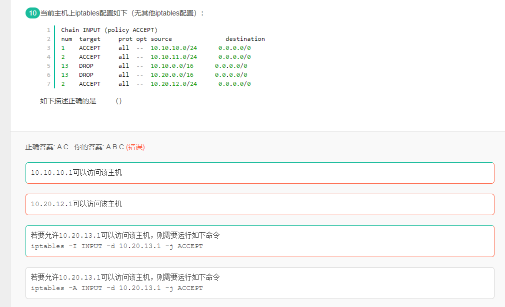 - iptables 的规则是先接受后拒绝,即前面的规则先生效。