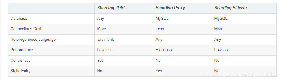可以看出sharding-jdbc作为一个组件集成在应用内,而mycat则作为一个独立的应用需要单独部署,drds则是阿里云的一个独立产品,不过需要结合rds一起使用。从架构上看sharding-jdbc更符合分布式架构的设计,直连数据库,没有中间应用,理论性能是最高的(实际性能需要结合具体的代码实现,理论性能可以理解为上限,通过不断优化代码实现,逐渐接近理论性能)。同时缺点也很明显,由于作为组件存在,需要集成在应用内,意味着作为使用方,必须要集成到代码里,使得开发成本相对较高;另一方面,由于需要集成在应用内,使得需要针对不同语言(java、C、PHP……)有不同的实现(事实上sharding-jdbc目前只支持java),这样组件本身的维护成本也会很高。最终将应用场景限定在由java开发的应用这一种场景下。