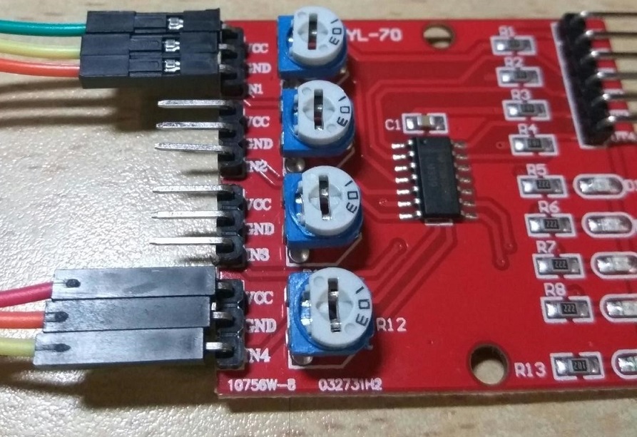 模块电路板中,每个与红外线探测器相连的接口共有三种口,分别是:VCC,GND,IN(1/2/3/4)