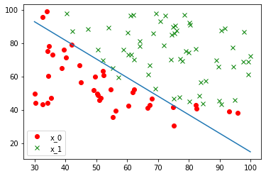 plot_y = (-w0*plot_x-b)/w1 #w1y+w0 x+b=0直线