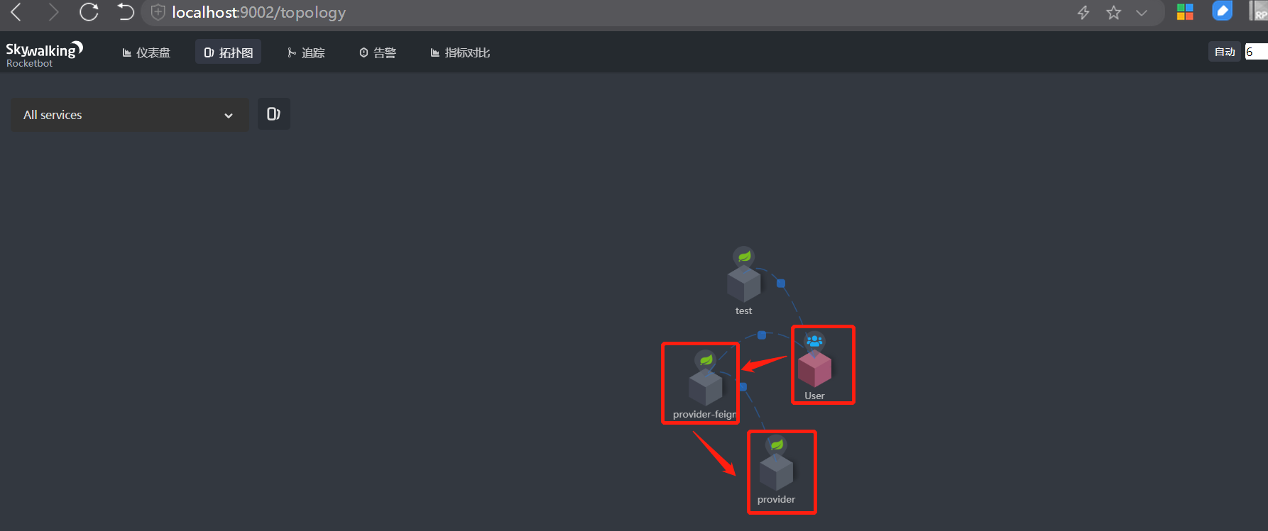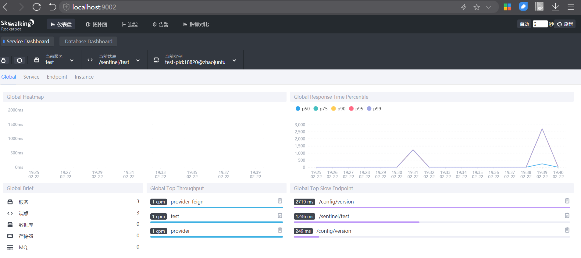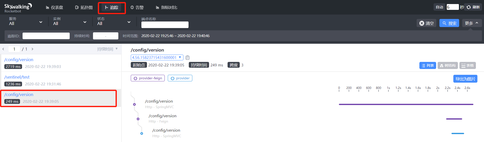 右侧调用表中, 紫色provider-feign有两个记录,一个是 http SpringMvc,一个是 http Feign,从浏览器开始,第一个http请求是SpringMVC类型(浏览器到provider-feign服务器),第二个请求是Feign(服务器provider-feign中把请求通过Feign转到provider服务器);蓝色provider有一个记录,即中转后provider服务器响应了这个请求。