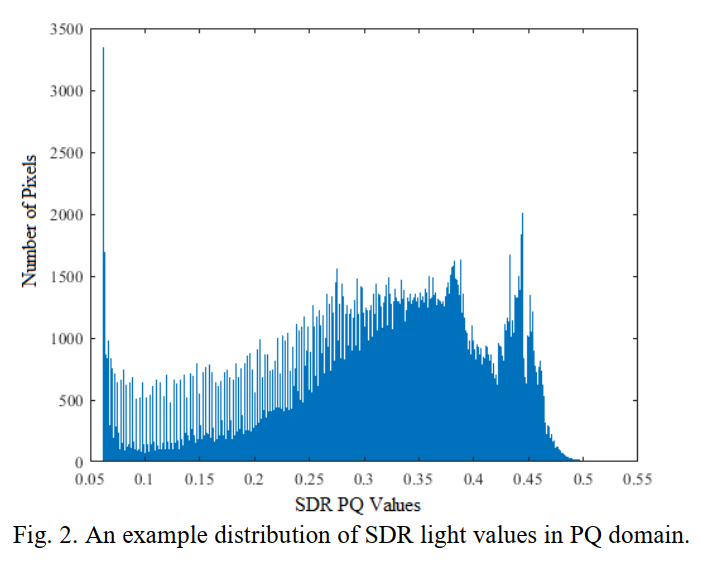 首先将捕获的SDR光值转移到PQ域中,因此映射过程利用了人类视觉系统的特征。 下一步是计算得到的PQ值的分布(直方图),它将PQ值分组到统一大小的bin中(即,每bin的亮度/亮度/强度值相同)。每个bin的高度表示具有这些光强值的帧中的像素数。图2是这种分布的一个例子。注意,本例中的SDR光值范围为0.1到100个nits,在PQ域中范围为0.0623到0.5081