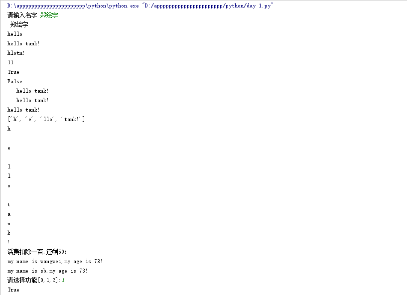 6月24日 周一 day1python基础学习内容一 编程语言 什么是编程语言? 上面提及的能够被计算机所识别的表达方式即编程语言,语言是沟通的介质,而编程语言是程序员与计算机沟通的介质。在编程的世界里,计算机更像是人的奴隶,人类编程的目的就命令奴隶去工作。 什么是编程? 编程即程序员根据需求把自己的思想流程按照某种编程语言的语法风格编写下来,产出的结果就是包含一堆字符的文件。 强调: 程序在未运行前跟普通文件无异,只有程序在运行时,文件内所写的字符才有特定的语法意义。二 计算机组成部分 CPU 内存 外存 输入设备 输出设备三 python的安装与使用 1.安装python解释器 2.安装pycharm编辑器 3.编写python代码,并输出打印hello world!四 变量可变化的量。 变量值: 是真实存放在内存中的一块内存地址。 变量名: 用于与变量值绑定关系的。 赋值=号: 将变量的值绑定给变量名的。 print("hello world!") name="Tank"//定义变量变量命名规范:1.驼峰命名法 AgeOfTank2. 推荐命名:age_of_tank变量名定义规范:1.要以英文字母或者下划线开头,不能以数字开头2.关键字不能命名变量名规范age_of_Tank=18不使用中文命名定义变量的三个特征:id #用来表示内存中的唯一内存地址type #变量值类型value #变量值name1 ='tank1'name2 ='tank1' # id:变量的值一样,内存地址是不一样的。 # nameI =‘ tankI'| # name2 = ' tank1' # python优化机制(小计数池) #在某个长度内,python把值相同的变量值统一存放在同一一个内存地址中。 # print (id (namel))# print (id(name2)) 自# type:用于判断变量的类型 str1 =’hello' print (type(str1)) # value str2 =’hello' print(str1 == str2)五 常量 不可变的量。 以全大写命名。 并不是不能对其修改,而是大家都规定好凡是全大写的变量都称之为常量,不可对其进行修改。 #常量:(本质上还是变量 在python中不会有任何机制限制你不能修改常量 但凡是大写默认为常量 不能进行修改 SCHOOL='合肥学院’ print(SCHOOL) 六、#用户与程序交互: 输入: Python3 input() name=input("请输入姓名") input 中输入的任何数据都是字符串 Python2 输出: print() 七:注释 单行注释 # 快捷键:ctrl+/ 多行注释 三引号'''''' 快捷键:'''+回车 #int 基本数据类型: 数字类型: 1.整型:int 人的年龄、身份ID号...sole:8 2.浮点型: float 人的身高体重、薪资 #int age = int(18)14 pr int (age) pr int (type(age)) age2 = print (age2) print (type(age2)) # float22 sal = 1.0123 pr int (sal) pr int (type(sal)) 代先掌握的操作: 1、按索引取値(正向取+反向取) : 只能取 2、切片(頤斗不顕尾,歩长) 3、长度len 4、成员运算in和not in 5、移除空白strip 6、切分split 7、循环1.素引取値(正向取+反向取) :只能取#正向取 str1 = 'hello tank!' print(str1[0]) # h print(str1[9]) # k #反向取 print(str1[-2]) # k2.切片(顾头不顾尾,步长)str1='hello tank!'#0-(5-1)print (str[0:5] #hello#步长print(str1[0:11] ) #hello tank!print(str1[0:11:2] ) #hlotn隔两个读一个3.长度lenprint(len(str1)) #114.成员运算in 和not inprint('h' in str1) #Tureprint('h' not in str1) #False5.移除空白Strip,lStrip,rStrip#会移除字符串中左右两边的空格str1=' hello tank!'print(str1)str1=' hello tank! ‘print(str1)print(str1.strip())#去除指定字符串str2='!tank'print(str2.strip('!'))6.切分splitstr1='hello tank!'#根据str1内的空格进行切分#切分出来的值会存放在[]列表中print(str1.split('')) #['hello','tank']7.循环#对str1字符中进行遍历,打印每一个字符for line in str1:print(line)字符串格式化输出str1='话费扣除%s,还剩%d:'%("一百",50)print(str1)#######字符串类型############1.Strip,lStrip,rStrip移除空白#会移除字符串中左右两边的空格str1=' hello wuyuefeng 'print(str1)print(srt1.strip())#移除字符串中左右两边的空格print(srt1.lstrip())#移除字符串中左边的空格print(srt1.rstrip())#移除字符串中右边的空格2.lower upperstr1='hello wuyuefeng'print(str1.lower())#转换成小写print(str1.upper())#转换成大写3.startswith endswithstr1='hello wuyuefeng'print(str1.startswith('hello')#判断str1字符开头是否是helloprint(str1.endswith('wuyuefeng')#判断str1字符结尾是否是wuyuefeng4.format (格式化输出)的三种玩法str1='my name is %s,my age is %s!'%('tank',18)print str1方式一 根据位置顺序格式化print('my name is {},my age is {}!'.format('tank',18))方式二 根据索引格式化print('my name is {0},my age is {1}!'.format('tank',18))方式三 指明道姓格式化print('my name is {name},my age is {age}!'.format(name='tank',age=18))#5.split切分str1='hello tank!'#根据str1内的空格进行切分#切分出来的值会存放在[]列表中print(str1.split('')) #['hello','tank']#6、join 字符串拼接#根据空格 将列表中的每一个字符串进行拼接print(' '.join(['tank','18','from GZ']))#根据_ 把列表中的每一个字符串进行拼接print('_'.join(['tank','18','from GZ']))#7.replace 字符串替换str1='my name is wangwei,my age is 73!'print(str1)str2=str1.replace('wangwei','sb')print(str2)#8.isdigit 判断字符串是否是数字choice=input('请选择功能[0,1,2]:')#判断用户输入的选择是否是数字print(choice.isdigit())