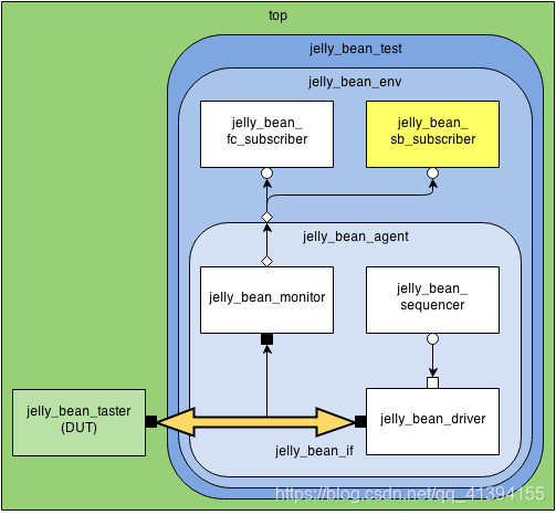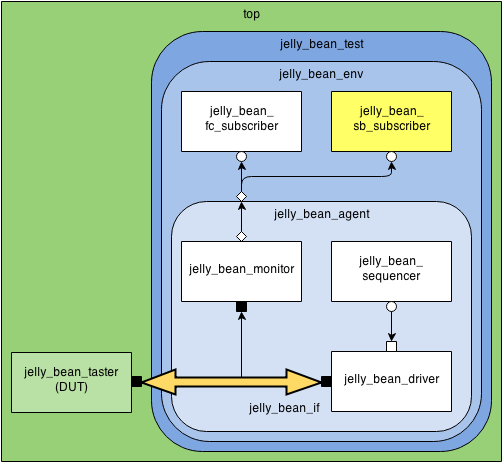 Taking this opportunity, I also simplified the scoreboard as the layered scoreboard used in Environment always confused the newbies. Here is the simplified hierarchy of the verification components. Note that the wrapper around the jelly_bean_sb_subscriber has been removed. You can compare this figure with the figure in Overview if you are interested.