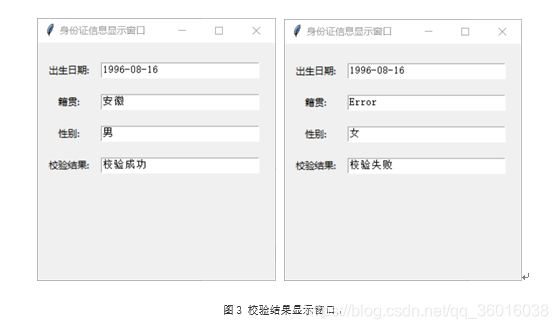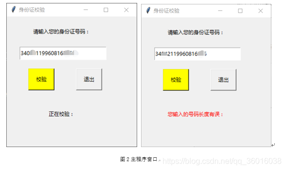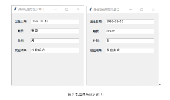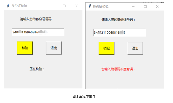 系统将用户输入的身份证号码读取并经过算法处理后,经由校验结果显示窗口进行交互显示,通过窗口可以清晰的看到身份证号码是否合格,若合格则可以得到正确的身份信息。