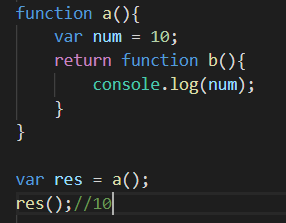变量res接受着函数a的返回值,res()调用了函数 b,打印的结果为10;这样就形成了一个不会自动销毁的a 函数的执行空间,我们称它为 闭包空间。