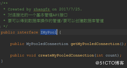 IMyPool是一个接口,对外提供数据库连接池的基本服务,比如得到一个数据库操作管道。