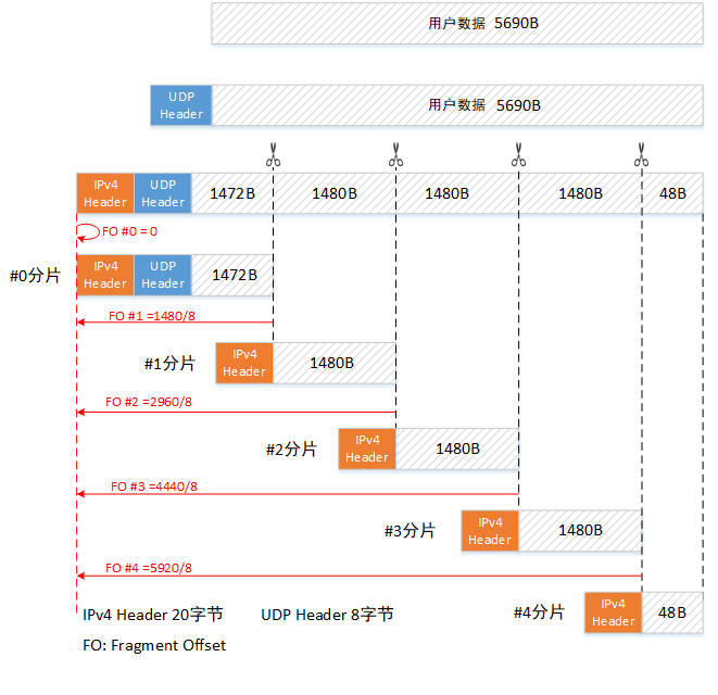 由于数据链路层MTU(最大传输单元)的限制,TCP/IP协议传送字节数比较大的数据时,发生IPv4报文分片现象(Fragmentation)。假设用户数据有5690字节,采用UDP传输,数据链路层MTU=1500字节,IPv4 分片示意图如下