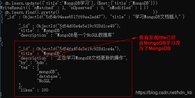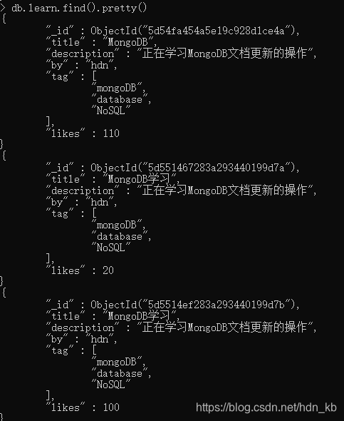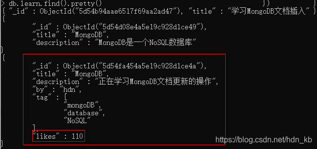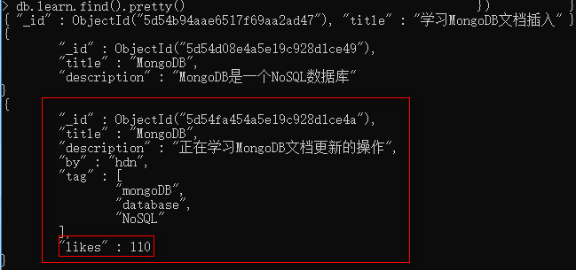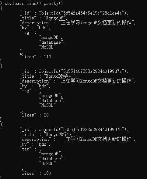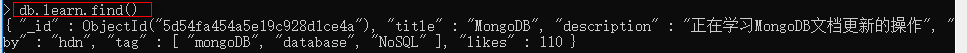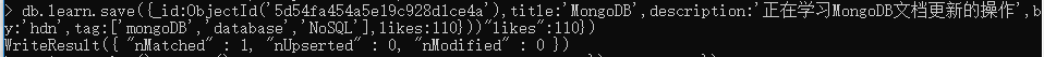 插入文档也可以使用db.learn.save(document)命令。如果不指定_id字段save()方法类似于insert()方法。如果指定_id字段,则会更新该_id的数据。