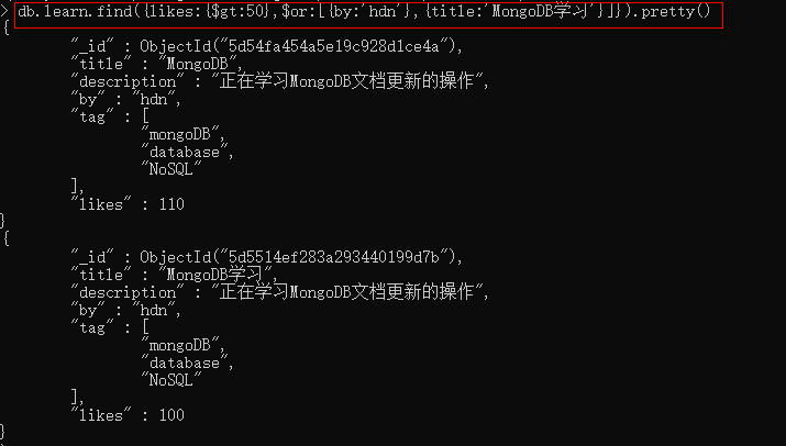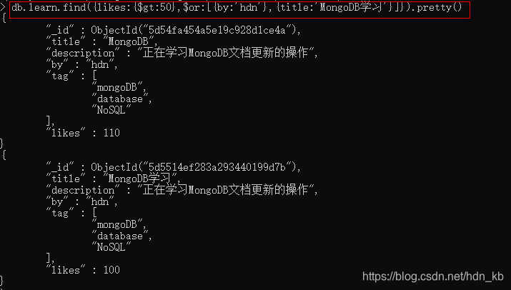 例子:where likes>50 AND (by='hdn' OR title='MongoDB学习')