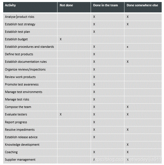 我们再也很少看到传统的测试经理角色:管理层级别的项目成员,他定义测试策略,制定测试计划,管理进行测试的人员并报告结果。 大多数传统的测试管理活动都是由团队完成的。