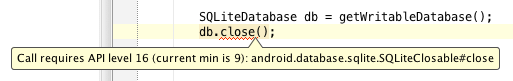 I'm getting the following error in Android studio. The sqlitedatabase.close() method is available since API Level 1 but the android studio ide fails to detect that.