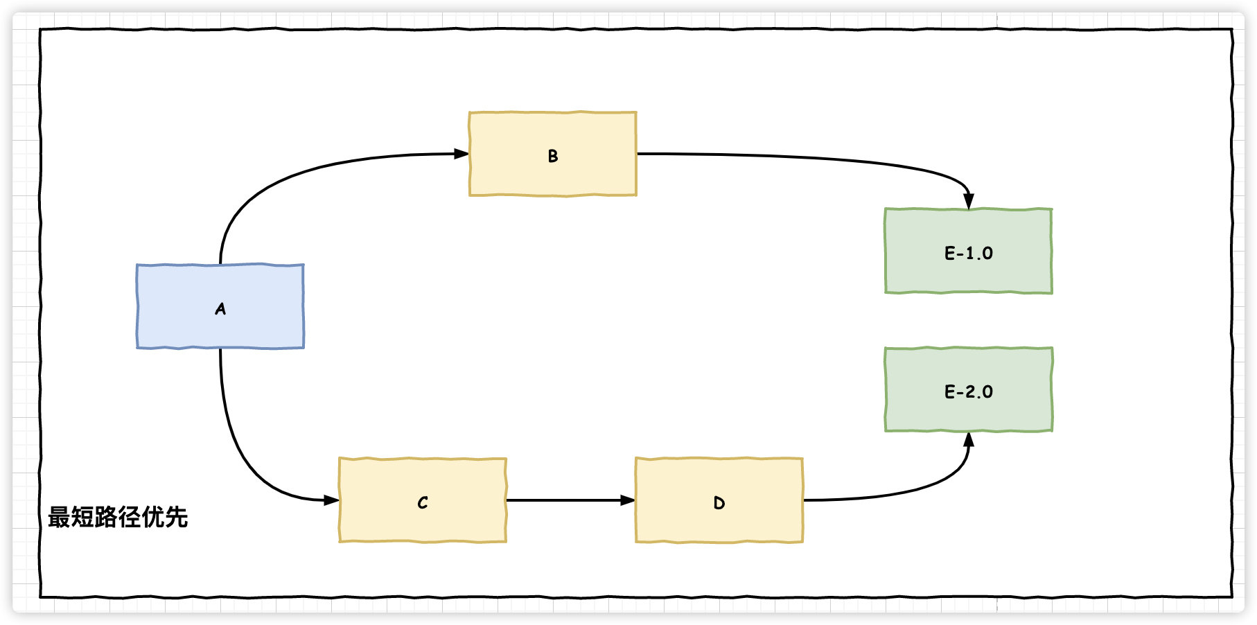 A 间接依赖两个版本 E,这种情况下,由于 A 到 E-1.0 路径最短,所以 A 中将会使用 E-1.0。
