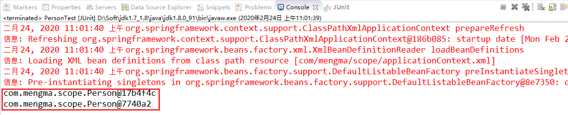 从上图可以看到,两次输出的结果相同,这说明 Spring 容器只创建了一个 Person 类的实例。由于 Spring 容器默认作用域是 singleton,如果不设置 scope="singleton",则其输出结果也将是一个实例。