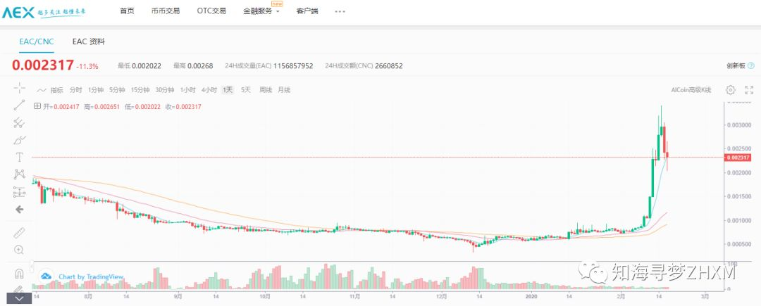 【比特时代EAC日K线:19年12月最低0.000318到近日最高0.00340涨幅已达10倍】