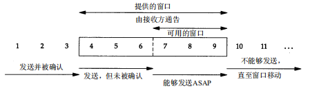 接收方通告的窗口称为提供的窗口,它覆盖了从第4字节到第9字节的区域,表明接收方已经确认了包括第3字节在内的数据,且通告窗口大小为6。窗口大小是与确认序号相对应的。发送方计算它的可用窗口,该窗口表明多少数据可以立即被发送。