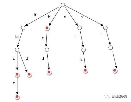 假设有b,abc,abd,bcd,abcd,efg,hii 这7个单词(实际使用中,这些单词就是敏感词),我们构建的树如下图