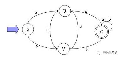 假定DFA M含有m个状态,n个输入字符,那么这个状态图含有m个节点,每个节点最多有n个弧射出,整个图含有唯一一个初态点和若干个终态点,初态节点冠以双箭头“=>”,终态节点用双圈表示,若f(ki ,a)=kj,则从状态结点ki到状态节点kj画标记为a的弧。
