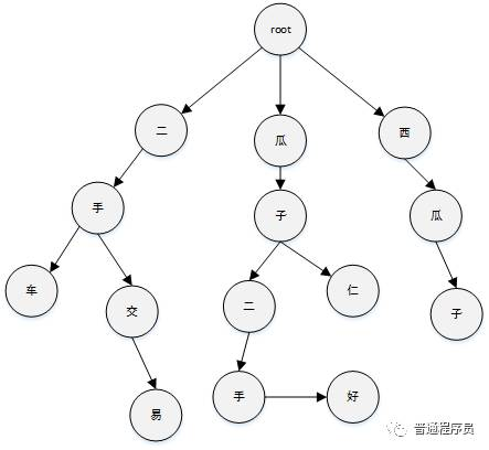 (1)第1个字“瓜”在Trie树的第一层节点(第一层节点有“二”、“瓜”、“西”三个字);继续(在中间的子树)往后找“子”字,在树枝的后续节点;继续找“二”,继续找“手”,继续找“车”,"车"字无法找到,查找失败。