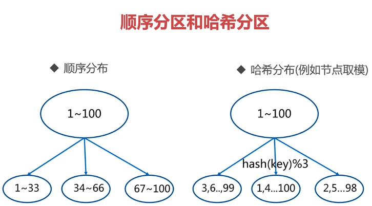单机情况下,对一份特别大的全量数据无法全部保存,只能使用集群模式,将全量数据按照一定规则分配到各个节点上。常用的分区有两个方式: