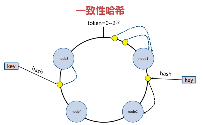 一致性哈希分区也是客户端分片方式,通过hash(key) % nodes + 顺时针规则找到对应的数据节点,相比于节点取余分区方式,一致性哈希算法特点: