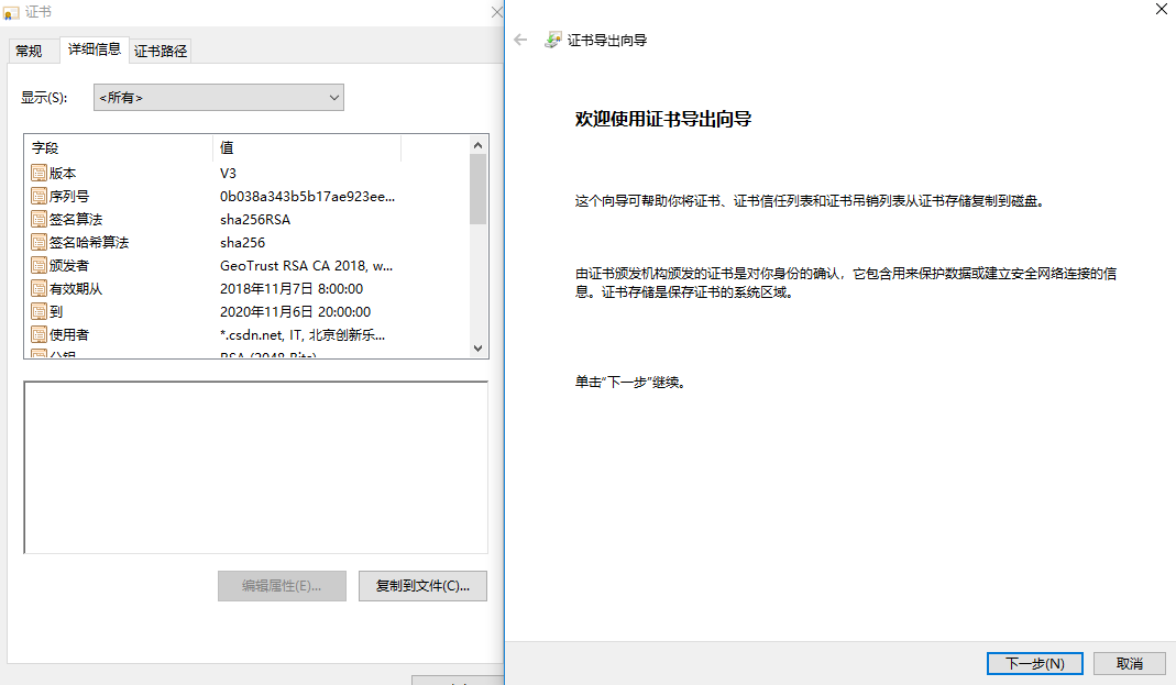 通过浏览器查看网站证书已经可以看到许多信息,版本号、签名算法、公钥,证书链和各种扩展项,如果我们想获取该证书,用浏览器的方式也很简单。在查看证书处,详细信息,复制到文件就可以选择以某种格式导出证书。