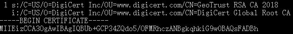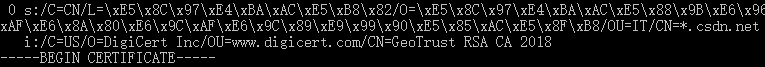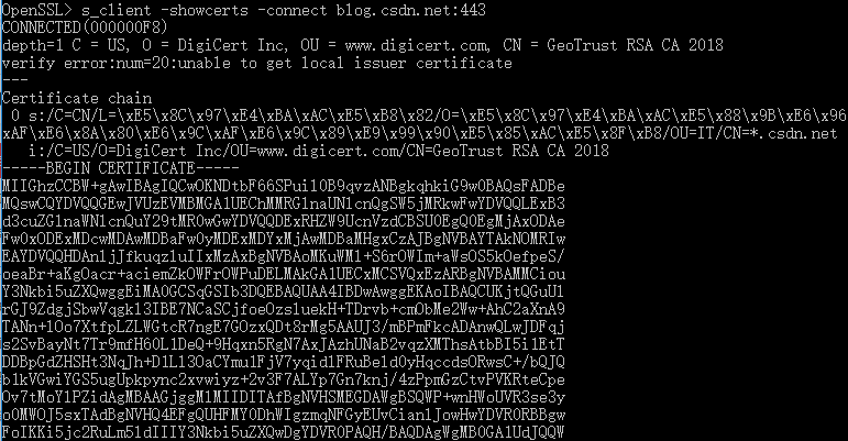 从Certificate chain证书链信息中可以看到,blog.csdn.net网站的服务器证书*.csdn.net,中间证书是Geo Trust RSA CA 2018,根证书DigiCert。往下看,从BEGIN CERTITICATE开始到END CERTITICATE就是证书的内容,如果BEGIN CERTITICATE前有编号为0,证明是服务器证书的内容,如果编号为1是中间证书的内容。在整个输出中我们都没有看到根证书的内容,因为根证书已经集成到了浏览器中。