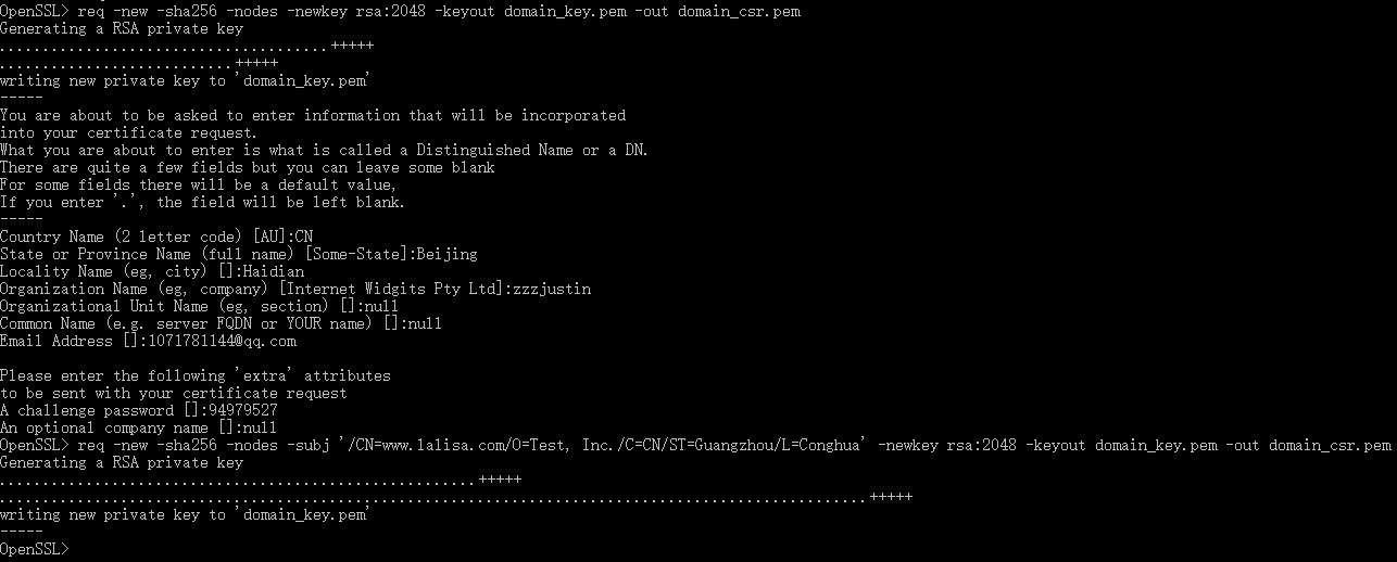 用req子命令可以选择交互式或者非交互式的方式来生成CSR文件和密钥对: