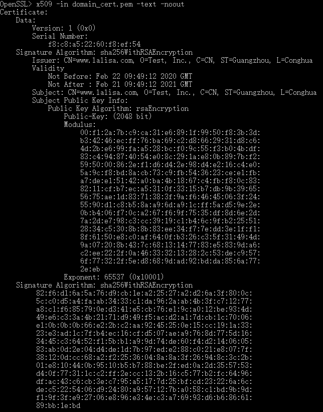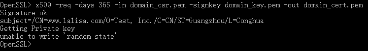 生成自签名的证书用x509子命令,其中-days参数顾名思义就是证书的有效期为365天,-in domain_csr.pem标识使用该CSR文件,-signkey domain_key.pem标识使用该密钥对的公钥,最后-out输出生成的证书文件domain_cert.pem,看到Signature ok表示签名成功。