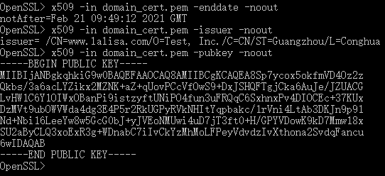 例如-endate参数,查看证书的过期时间,记得上面设置的是365天也就是一年,这里第二行过期时间就是2021年。还有下面的-issuer参数,查看证书的使用者,也就是签发该证书的CA机构,由于这是一张自签名证书,签发者当然就是我们前面设置的信息。-pubkey参数用来查看证书公钥。