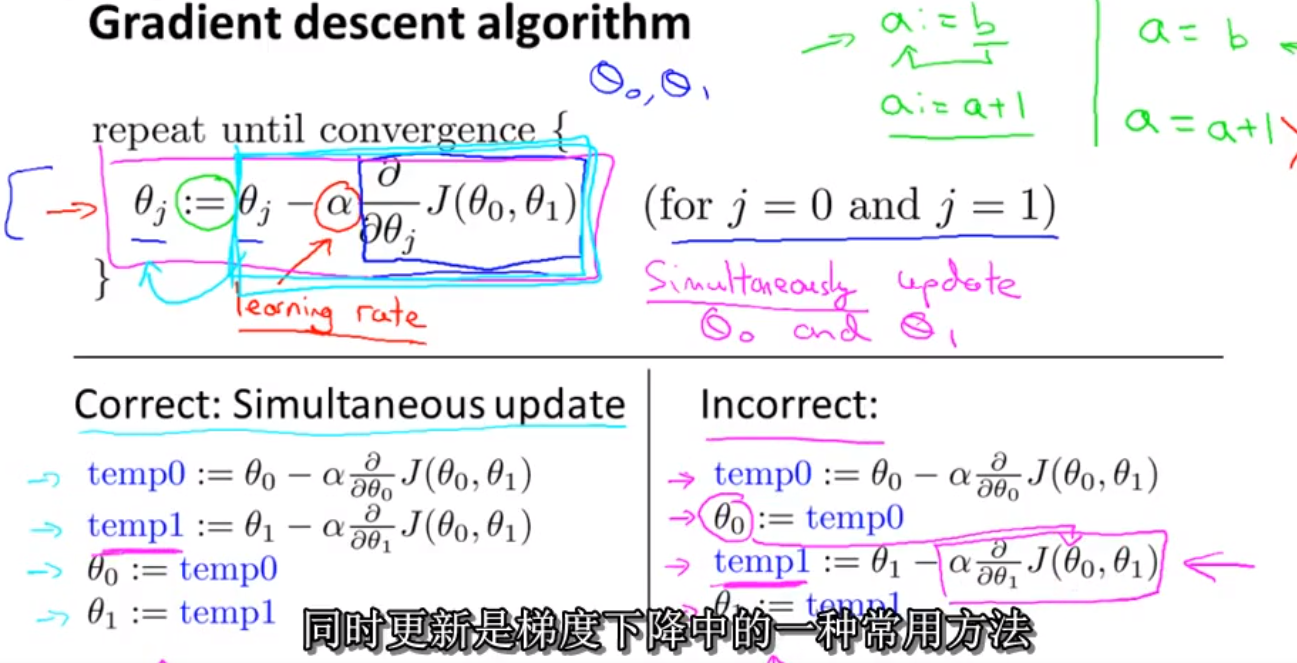 - 右边错误是因为temp1中采用了更新后的θ0,而梯度下降算法中要求的是同时更新;右边是另外一种算法