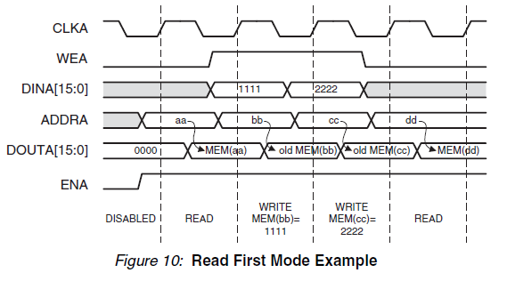 2 Read First Mode: In READ_FIRST mode, data previously stored at the write address appears on the data output, while the input data is being stored in memory. This read-before-write behavior is illustrated in figure 10. (先前存储在写地址处的数据出现在数据输出上,而输入数据存储在存储器中)