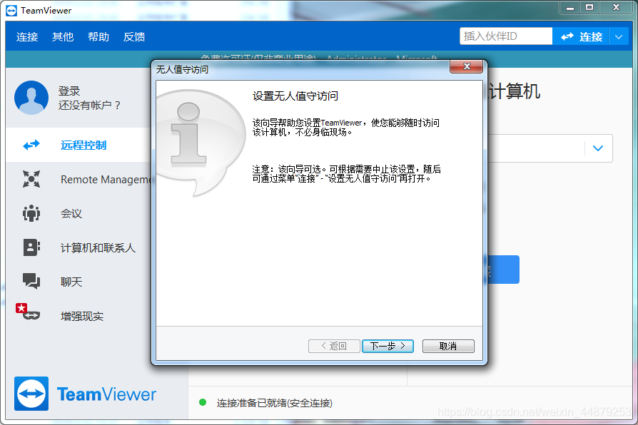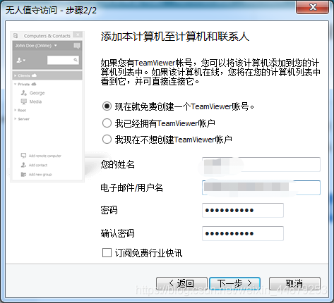 因为我没有teamviewer账户,所以创建一个,不想创建可以直接点下一步的