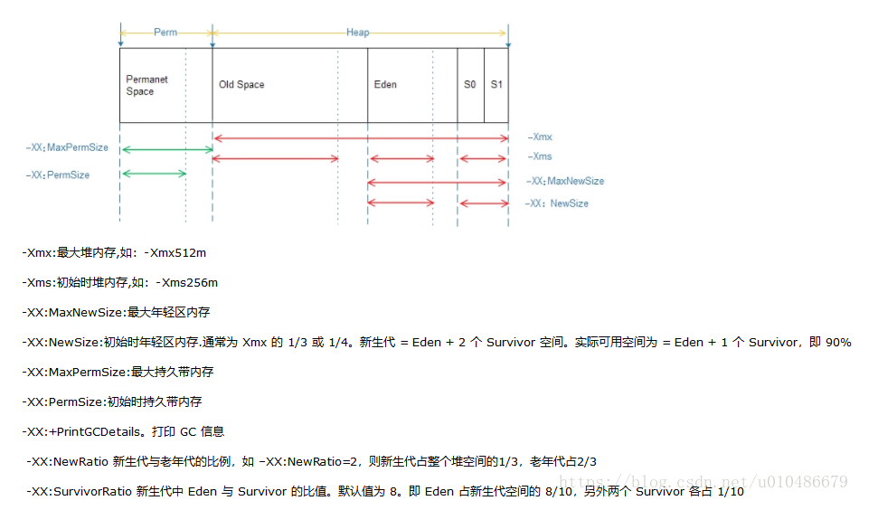-XX:NewRatio=n:设置年轻代和年老代的比值。如:为3,表示年轻代与年老代比值为1:3,年轻代占整个年轻代年老代和的1/4