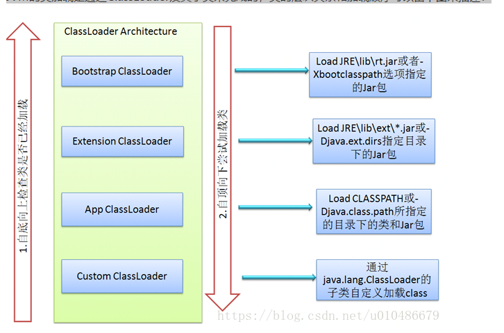 属于应用程序根据自身需要自定义的ClassLoader,如tomcat、jboss都会根据j2ee规范自行实现ClassLoader加载过程中会先检查类是否被已加载,检查顺序是自底向上,从Custom ClassLoader到BootStrap ClassLoader逐层检查,只要某个classloader已加载就视为已加载此类,保证此类只所有ClassLoader加载一次。而加载的顺序是自顶向下,也就是由上层来逐层尝试加载此类。