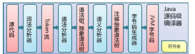 Java 源码编译由以下三个过程组成:分析和输入到符号表;注解处理;语义分析和生成class文件