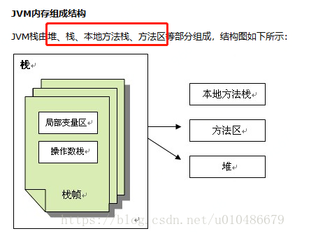 栈中存放一个个栈帧,每个栈帧对应着每个方法的每次调用,而栈帧又是有局部变量区和操作数栈两部分组成,局部变量区用于存放方法中的局部变量和参数,操作数栈中用于存放方法执行过程中产生的中间结果。栈的结构如下图所示:
