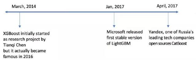2014 年 3 月,XGBOOST 最早作为研究项目,由陈天奇提出2017 年 1 月,微软发布首个稳定版 LightGBM2017 年 4 月,俄罗斯顶尖技术公司 Yandex 开源 CatBoost