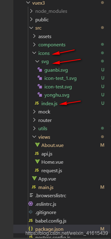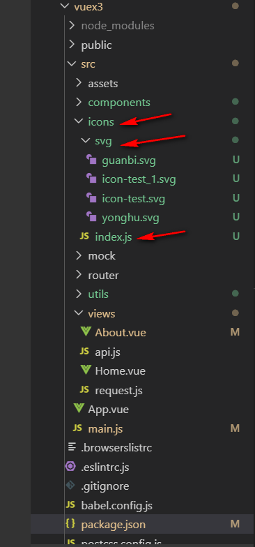 2.在阿里iconfont下载好icon,保存成svg格式, 放在vue项目文件下面,我这里是icon文件夹,然后创建一个index.js文件
